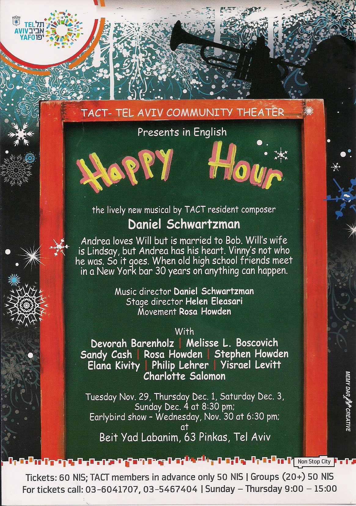 These are just a few written in the last few years (since 2007), one of which (Checking In) was performed in 2008 by The Tel Aviv Community Theatre. Happy Hour was performed in November of 2011 in Tel Aviv and was a great hit! Audiences loved it!